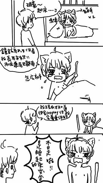 「才不是!突然就長出來了!連尾巴都有!」聽到對方這樣一說,珉豪又氣又急,一面吼著眼淚也簌簌的掉下來,他抓起身後長長的黑尾巴,唔咽的說著:「怎麼會這樣…一睡醒就…」